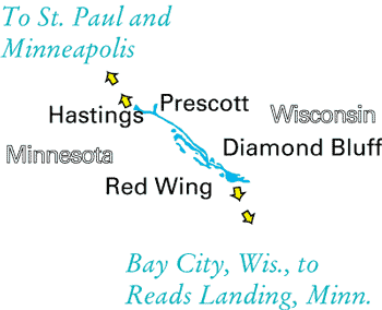Clay dug from local pits was formed into the famous crocks, jugs and dishes of the Red Wing Stoneware Co., now prized by antique collectors nationwide. The company began in 1878 and operated until 1967. Today, shoppers explore the old brick building that was the pottery factory, now a shopping center called Pottery Place. A grandson of the last company president, Scott Gillmer, currently operates Red Wing Potteries Inc. near the site of the old factory. For the last 99 years, workboots and shoes have been manufactured in Red Wing. The Red Wing Shoe Co., the citys second largest employer, is headquartered downtown and owns many of the historic buildings there. Several parks in Red Wing bring visitors to the riverfront. Colvill Park (locals pronounce it Cuh-vull) and Bay Point Park are great places to spend a lazy afternoon by the river under the shade of a cottonwood tree watching the parade of pleasure boats and commercial tow traffic. Downtown, visitors can take a picnic lunch and watch the towboat pilots negotiate the sharp riverbend passing at Levee Park. For solitude, try Barn Bluff, the huge limestone dome that punctuates the shore of the river just downstream from the bridge. Hikers who climb the steep trail to the top are rewarded with a view of Lake Pepin. One end of the Cannon Valley Trail is upstream from downtown. The 20-mile, paved trail follows the Cannon River to Cannon Falls. Above Trenton Island, a single channel winds up to Lock and Dam 3. The Wisconsin side of the river is undeveloped for ten miles beyond the tiny village of Diamond Bluff (pop. 479) and characterized by high, rugged, stone bluffs. Prairie Island is bound by the sloughs and backwater lakes of the Vermillion River on the west, and by Sturgeon Lake, a wide spot in the Mississippi, on the east. The island is home to two uneasy neighbors the Prairie Island Mdewakanton Dakota reservation and the Prairie Island Nuclear Power Plant. The tribe operates a large hotel, casino and marina and is the areas largest employer, hosting about 2,000 jobs. The Wisconsin shore of the Mississippi ends at Prescott (pop. 3,764) at the mouth of the St. Croix River. Organized in 1839, the town was named after Indian agent Philander Prescott, an early speculator who believed that the towns situation at the junction of the two major rivers would ensure its development into a major city. Instead, Prescott is a major center for recreational boating for both rivers. Take in the spectacular view of the joining of the rivers from the blufftop at Freedom Park in Prescott.